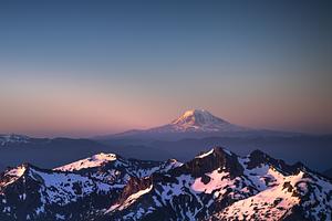 This photo shows Mount Adams at almost eye level on-top of the Rainier Range consisting of Pinnacle Peak, Denman Peak, Lane Peak, and Foss Peak. This photo was taken at ~10,000ft and only costed me fainting once on the way up.