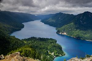 This photo was taken at the false summit of Mount Storm King. This viewpoint shows Lake crescent dividing the Olympic Ranges with Pyramid Peak on the right being the most prominent of the bunch. It took a rope to climb up to this false summit.