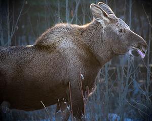 The Alaskan Moose is the largest of the moose species to exist. They are commonly found in the mainland Alaska rather than closer to the ocean. The males joust with their antlers to win over the females. The picture shown here is a female following us to Denali National Park.
